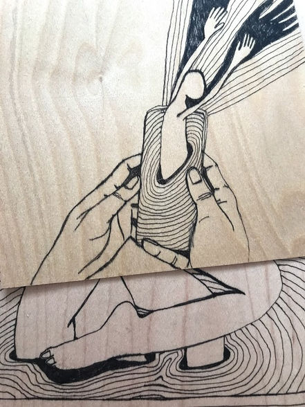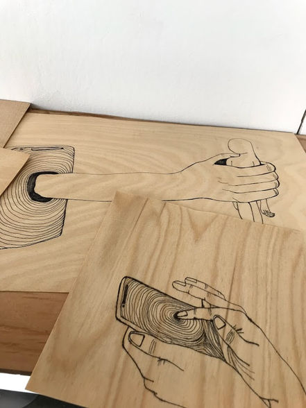 A series of ink drawings on delicate, rough pieces of wood, all resting on a hand-made wooden table. This piece Handle with Care explores our relationship with technology and the effects it has on our mental health, relationships and self-perception. Visitors were invited to handle and hold these delicate drawings. This piece was featured in the UBC BFA Graduating Exhibition Weird Flux in 2019 in Vancouver, Canada.